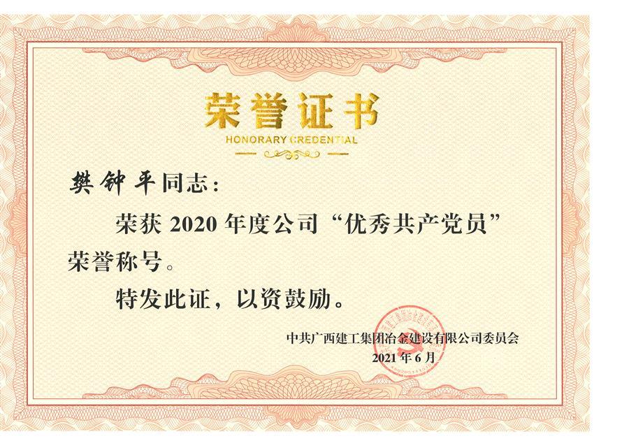 樊鐘平被評為2020年度冶建公司優(yōu)秀共產(chǎn)黨員