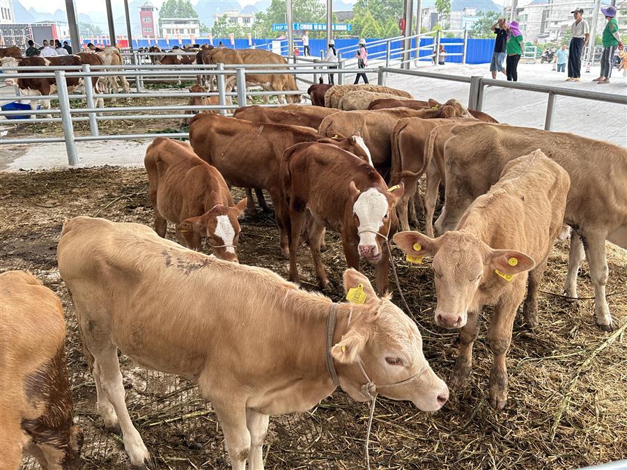 活動(dòng)現(xiàn)場(chǎng),熱鬧非凡,大家參觀了農(nóng)特項(xiàng)目園區(qū)及桂中牛行,并對(duì)園區(qū)今后的發(fā)展提出了意見和建議。桂中牛行作為農(nóng)特項(xiàng)目園區(qū)內(nèi)的首個(gè)主力商家,主營活牛羊交易,副營馬、驢、騾子等草食動(dòng)物交易。試業(yè)當(dāng)天,牛群“哞哞”聲此起彼伏,一頭頭體格健壯的牛兒一字排開,人們?nèi)宄扇旱貒墼谝黄穑屑?xì)挑選著心儀的牛兒。一旁的牛崽交易市場(chǎng)內(nèi),買家更是爭(zhēng)相搶購體態(tài)良好的牛崽,市場(chǎng)交易紅火。