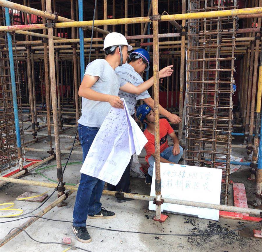 6月18日,在桂華分公司承建的梧州佛子時代廣場項目現(xiàn)場,當空烈日讓偌大的工地一片熾熱,焊花飛濺,工程車來來往往,工人們揮汗如雨。雖然施工作業(yè)已經(jīng)避開了高溫時段,但工人們?nèi)员缓顾粤搜劬?,濕了衣服。盡管這樣,大家仍堅持“全副武裝”,手套、防護用具,安全帽,一樣都沒有少,自覺遵守安全文明施工相關(guān)規(guī)范。入行兩年的施工員趙俊財抹了一把汗說道:“剛參加工作時,不能和家人一起過節(jié)還挺難受的,后來把心態(tài)調(diào)整好了,想著只要家人安好,其實比什么都重要,趁著年輕,還是應該多奮斗?!笨粗幻装舜髠€的他手拿圖紙和卷尺,蜷縮著身子,蹲在空間有限且熱得發(fā)燙的平臺上仔細檢查剛剛綁扎好的鋼筋籠,驕陽烤得他黝黑的皮膚泛出一層水光,襯著那還略顯年輕的臉龐,顯得熠熠生輝。