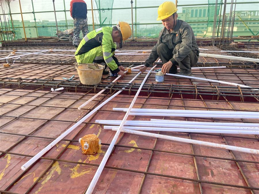 為搶抓項目建設黃金期,項目部組織全體管理人員堅守崗位,進一步優(yōu)化施工組織設計,嚴格管控施工安全、質量,會同業(yè)主、監(jiān)理單位加班加點忙建設,全力保障項目建設按照既定時間節(jié)點推進。截至目前,已完成生產調度用房1-4層主樓框架施工和水泵房底板防水施工。