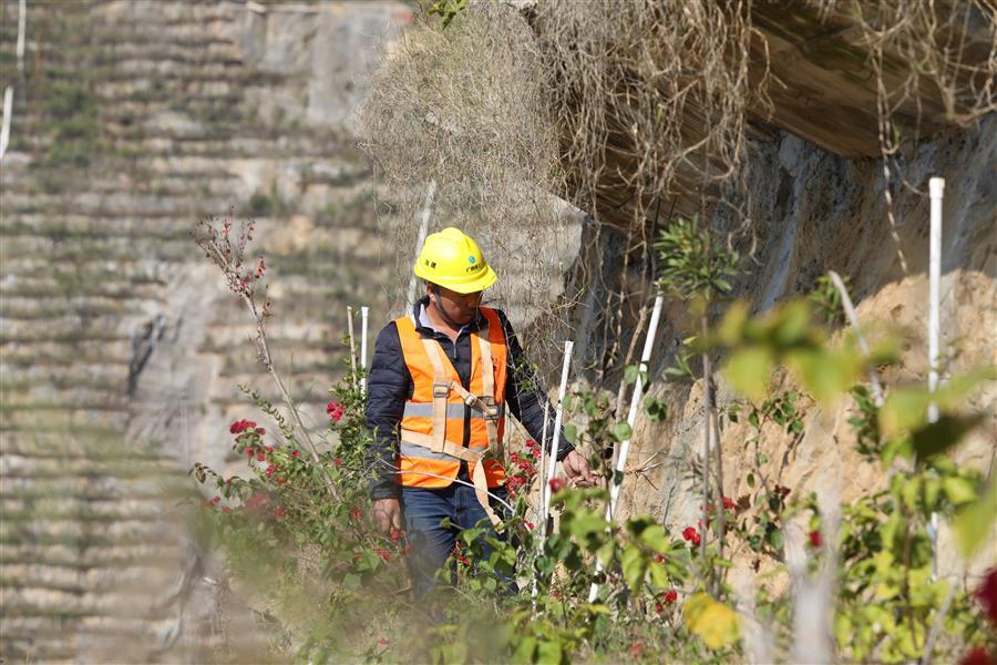 12月19日,一名工人在峭壁上護(hù)理綠植。
