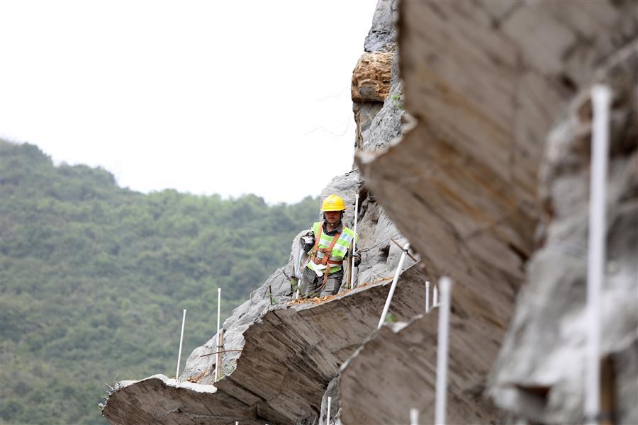 3月22日,一名工人在安全帶和安全繩的保護(hù)下施工作業(yè)。