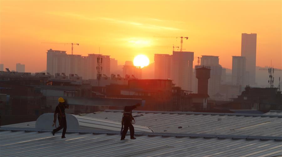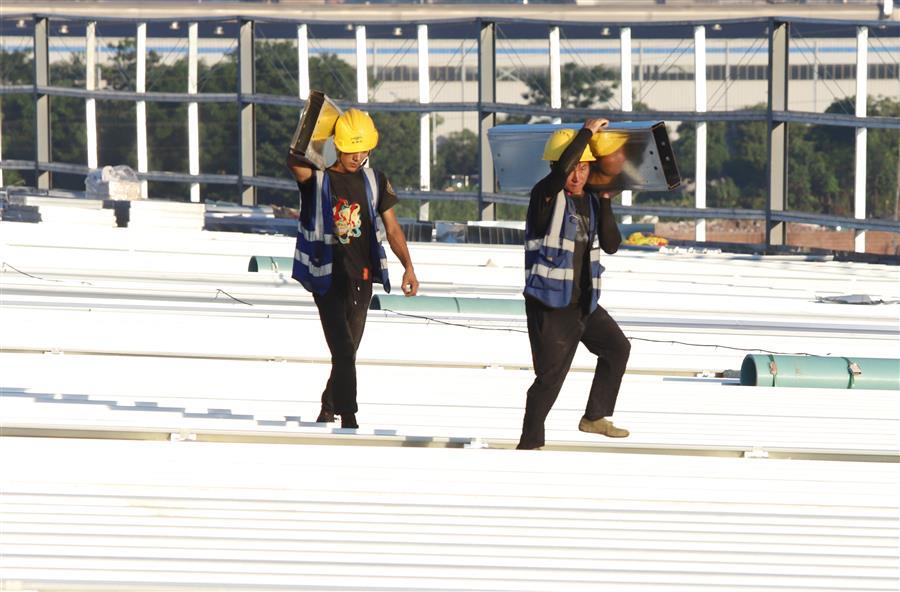 7月25日清晨,在廣西柳州柳工集團(tuán)柳工裝載機(jī)燈塔工廠項(xiàng)目工地,工人在屋面施工。