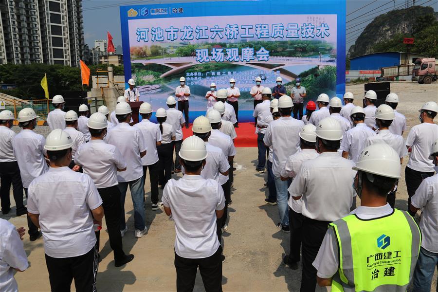 8月1日,冶建公司工程質(zhì)量技術(shù)現(xiàn)場(chǎng)觀摩會(huì)在桂金分公司施工的河池市龍江六橋(輝樂(lè)橋)工程項(xiàng)目舉行。公司總經(jīng)理、黨委副書(shū)記蒙勝益,副總經(jīng)理唐峰,副總經(jīng)理、安全總監(jiān)何勇參加。