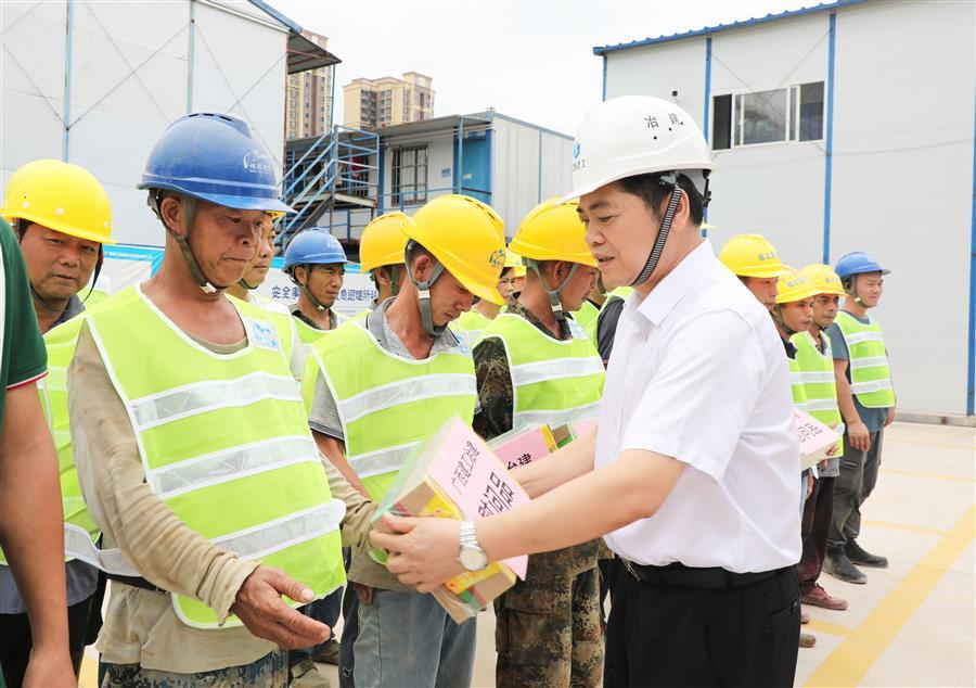 7月27日、28日,冶建公司總經(jīng)理、黨委副書記蒙勝益先后到深圳分公司承建的羅城硅晶新材料研發(fā)開發(fā)制造一體化項(xiàng)目(一期),第四分公司承建的柳州市河表片區(qū)標(biāo)準(zhǔn)廠房(一期)項(xiàng)目,開展“送清涼”慰問(wèn)活動(dòng),為堅(jiān)守在項(xiàng)目一線的建設(shè)者送去公司的關(guān)懷和防暑降溫物資。