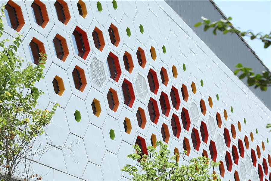 項(xiàng)目建筑外立面設(shè)計(jì)將柳州本土文化元素“紫荊花”與康恒公司“蜂巢”理念完美融合,多層次的幕墻肌理協(xié)同自然光線,在不同照射條件下呈現(xiàn)出多樣的光影效果,不僅呼應(yīng)了垃圾焚燒發(fā)電精細(xì)的工藝流程,更體現(xiàn)了人與自然和諧共生的美好愿景。