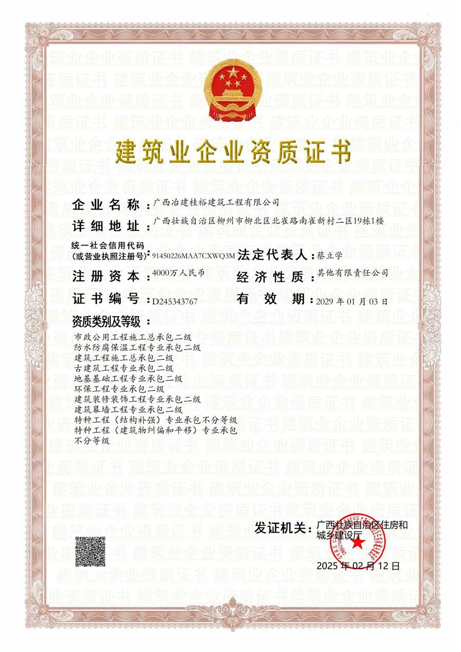 這8項專業(yè)承包資質分別是:防水防腐保溫工程、古建筑工程、地基基礎工程、環(huán)保工程、建筑裝修裝飾工程、建筑幕墻工程、特種工程(結構補強)、特種工程(建筑物糾偏和平移)專業(yè)承包資質。此批資質將為桂裕公司后續(xù)的業(yè)務承攬、拓展區(qū)域市場提供有力保障,為冶建公司高質量發(fā)展添磚加瓦。