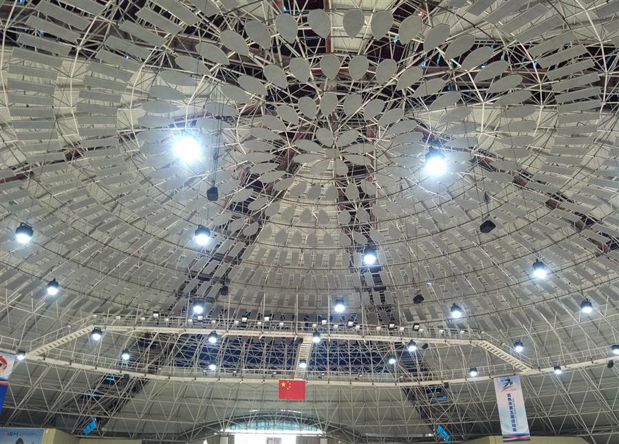 靖西市體育中心(主體育館)項(xiàng)目為主體框架結(jié)構(gòu)、屋蓋鋼結(jié)構(gòu)雙層網(wǎng)殼,建筑層數(shù)為地上三層,總建筑面積14575.74m2,建筑高度為33.40m,設(shè)計(jì)使用年限50年,建筑抗震設(shè)防烈度為6度。屋蓋鋼結(jié)構(gòu)雙層網(wǎng)殼球殼網(wǎng)架高度32.4m,球殼直徑89.994m,建筑投影面積6350m2,觀眾座位數(shù)5909個(gè)。工程為圓形鋼網(wǎng)殼結(jié)構(gòu),采用下弦柱點(diǎn)支承方式,豎向支承面標(biāo)高10.7m,支座中心布置在直徑為89.994m的圓周上,跨度大,單體工程量大,網(wǎng)殼構(gòu)件種類多;在網(wǎng)殼上面有四個(gè)花瓣造型(壯鄉(xiāng)繡球形狀),花瓣造型四底腳采用桁架結(jié)構(gòu)。
