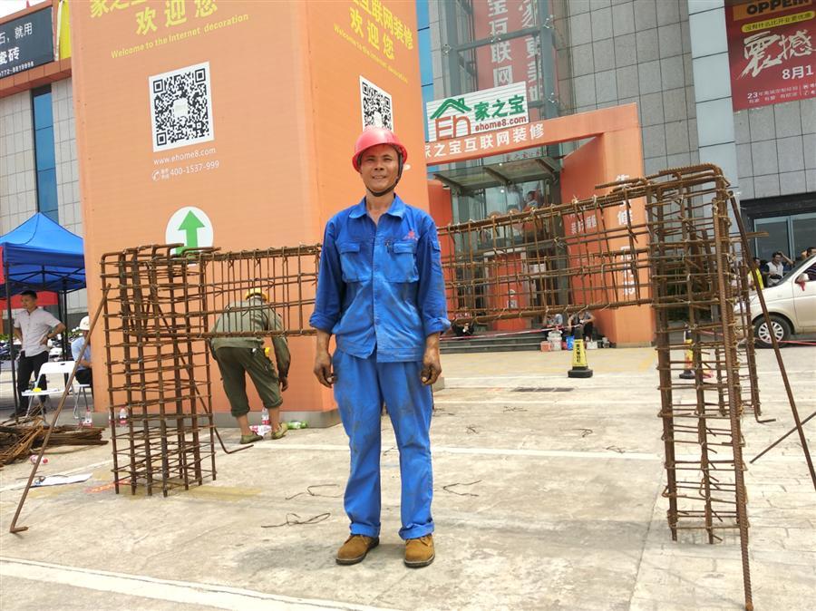 8月31日,在柳州家居建材博覽中心室外廣場上,一群頭戴安全,身著工裝的農(nóng)民工在各自忙碌著,不時(shí)傳來“叮叮?!变摻钆鲎猜暋ⅰ皣W嘩嘩”刨木聲、“咚咚咚”敲磚聲……伴隨著一片熱鬧的聲響,柳州市第四屆農(nóng)民工技能大賽暨柳州市第三屆農(nóng)民工家庭服務(wù)業(yè)大賽火熱舉行。