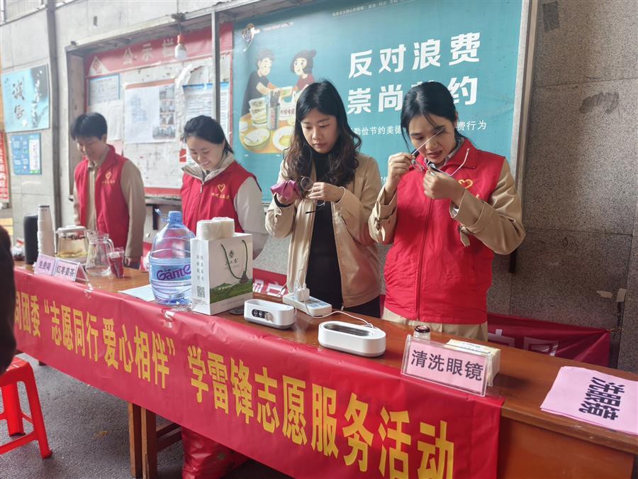 活動現(xiàn)場,志愿者們?yōu)樯鐓^(qū)居民提供清洗眼鏡、贈送紅棗姜茶、清除小廣告、防詐宣傳等志愿服務,為社區(qū)居民送去溫暖與便利。