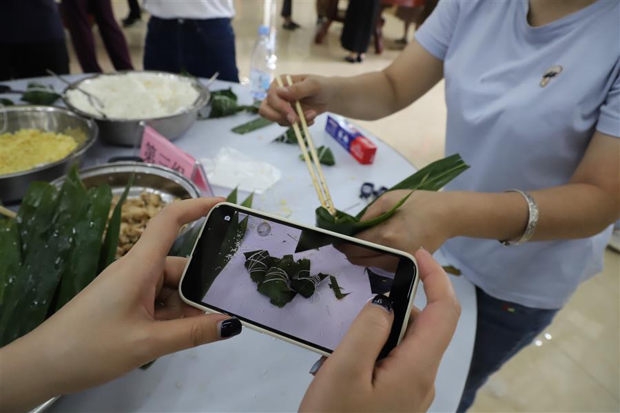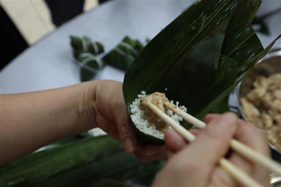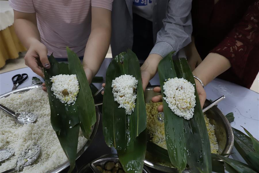 經(jīng)過(guò)簡(jiǎn)單的現(xiàn)場(chǎng)教學(xué)后,大家領(lǐng)取材料,分組配合,踴躍參與包粽子比賽,只見(jiàn)大家捋粽葉、放餡、封口、扎捆,動(dòng)作一氣呵成,不一會(huì)兒,一只只各式各樣的粽子就在大家手中成型。